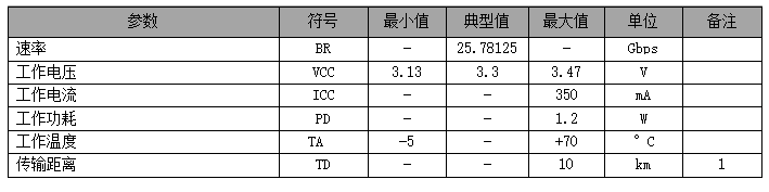 测试条件:消光比ER=2.0dB,PRBS 2^31-1测试码型,25.78125Gbps速率下BER≤5E-5。